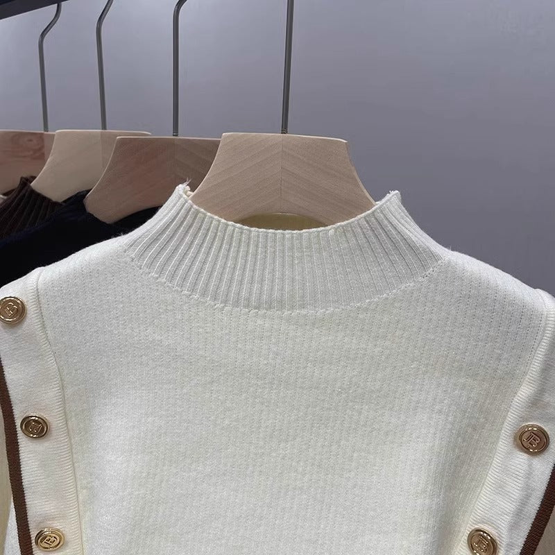 Combine o Suéter Chic com calças de alfaiataria ou jeans skinny para um look moderno e confortável. Adicione botas de cano alto ou scarpins para elevar o visual. Acessórios dourados complementam perfeitamente o charme dos botões.