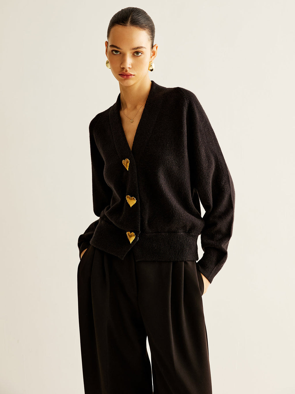 O Cardigan de Lã com Botões de Coração é perfeito para quem busca aliar sofisticação e um toque romântico em seus looks. Feito com lã macia de alta qualidade, ele oferece aconchego e estilo em dias mais frescos. Os botões em formato de coração dourado acrescentam um charme único, tornando esta peça ideal para ocasiões especiais ou para trazer elegância ao dia a dia.